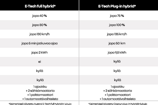 Helpoimmin eritasoiset hybridit erottaa toisistaan ajoakun energiasisällön mukaan, mikä ilmoitetaan kilowattitunteina (kWh). Toinen yhtä ratkaiseva asia on sähkömoottorin teho, joka puolestaan kerrotaan kilowatteina (kW). Yhdessä ne kertovat, voidaanko hybridillä ajaa pelkästään sähköllä ja kuinka pitkälle sähkö riittää. Kevythybridissä käytetään joko 12 tai 48 voltin virtaa, jolla voi ehkä ajaa muutaman metrin sähköllä. Oikeassa hybridissä, kuten Renaultin E-Tech full hybridissä, käytetään 200 tai 400 voltin virtaa, ja niillä voi ajaa sähköllä useita kilometrejä.