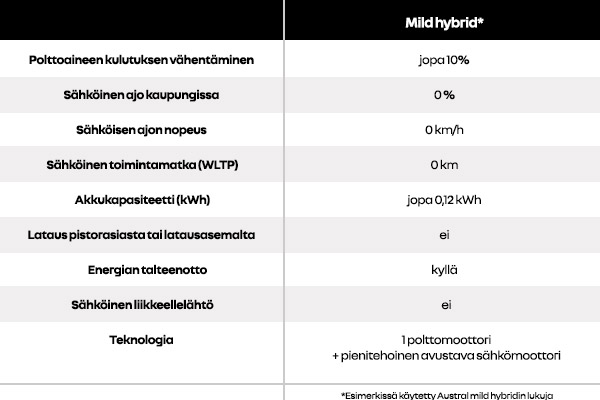 *WLTP, todelliset ajo-olosuhteet, ajotyyli ja akun tila voivat poiketa testitulosten olosuhteista. Esimerkissä käytetty Austral E-Tech full hybrid -auton lukuja.