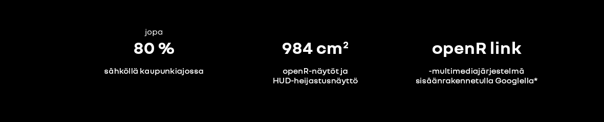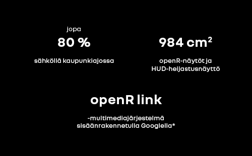 Yksi suurimmista digitaalisista näyttöpinnoista, jopa 774 cm² pinta-ala on jaettuna kahdelle 12'' näytölle. Ainutlaatuinen ja mukaansatempaava kokemus syntyy openR -link multimediajärjestelmän sisäänrakennetulla Googlella* sekä uuden sukupolven openR-kojelaudan optimoiduilla väreillä. Lisäämällä tuulilasin heijastusnäytön, saat yhteensä huimat 984 cm² näyttöpintaa käyttöösi.
