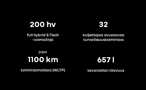 Renault Austral -mallissa yhdistyvät tasapainoiset mittasuhteet, urheilullinen tyyli, uusi voimakkaan näköinen keula 3D-timanttikuvioinnilla sekä hienostuneet ledivalot. Tyylikäs sisusta ja ergonomiset istuimet antavat viimeistellyn vaikutelman. Nauti personoidusta ajokokemuksesta openR link -multimediajärjestelmän ja sen sisäänrakennetun Googlen kanssa sekä uudesta face ID -kasvojentunnistuksesta mukavuustoiminnoilla.