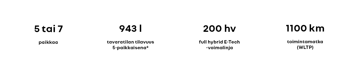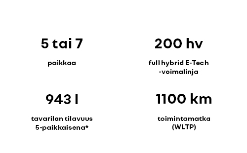 Renault Espace on saatavana 5- tai 7-paikkaisena versiona. 200-hevosvoimainen full hybrid E-Tech -voimalinja Renault Espace tarjoaa jopa 1100 km toimintamatkan (WLTP) ilman lataamista. Renault Espacen uudistunut muotoilu tulee esiin sen vahvan etusäleikön ja sähköisesti himmentyvän solarbay®-panoraamalasikaton myötä. Edistyksellinen openR link -multimediajärjestelmä sisäänrakennetulla Googlella ja valittavissa mieleiset sovellukset lukuisten vaihtoehtojen joukosta*.