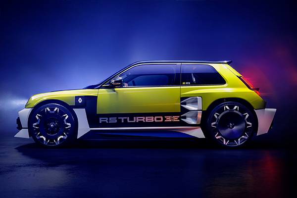 Äärimmäisen urheilullinen profiili, erittäin suuret levikkeet, enintään 20” vanteet, latausliitin sivun ilmanottoaukon yläpuolella: Renault 5 Turbo 3E, ei kompromisseja.