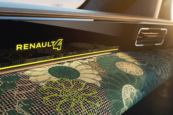 Kojelaudan ja istuimien koristeluun on käytetty päivänkakkaroiden, Renault 4 -siluettien ja numeron 4 yhdistelmiä, mikä luo selvästi tyylikkään ja taiteellisen tunnelman.