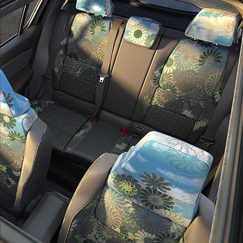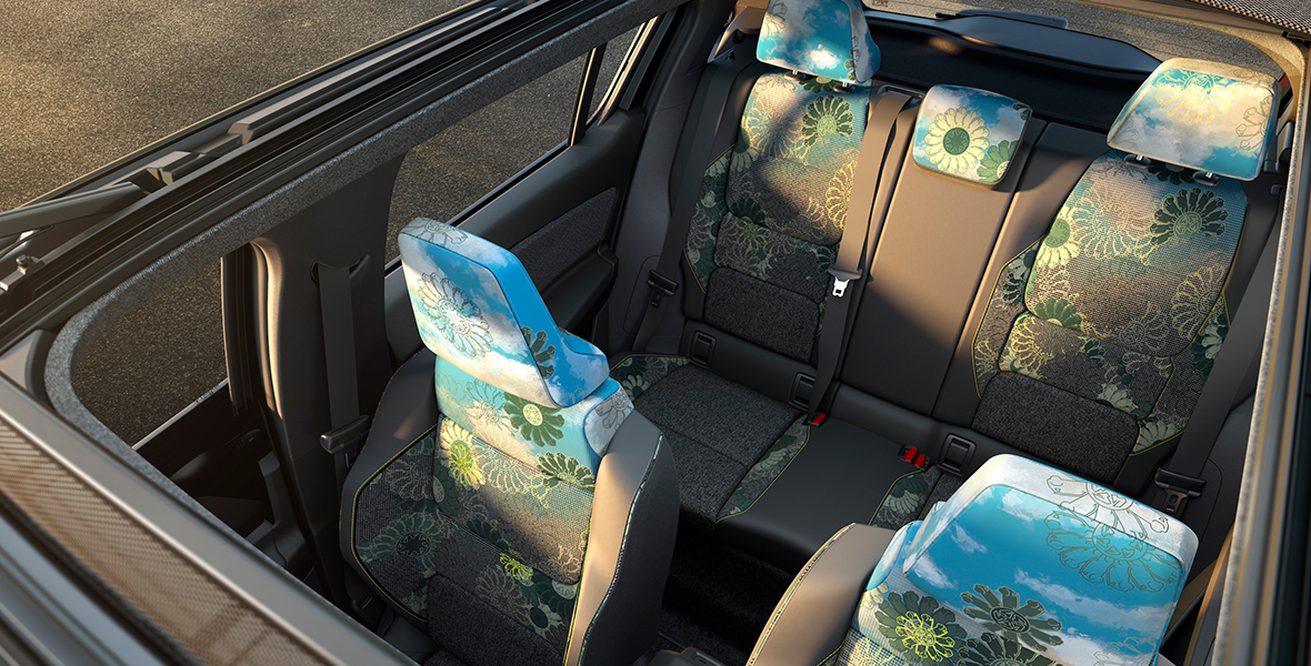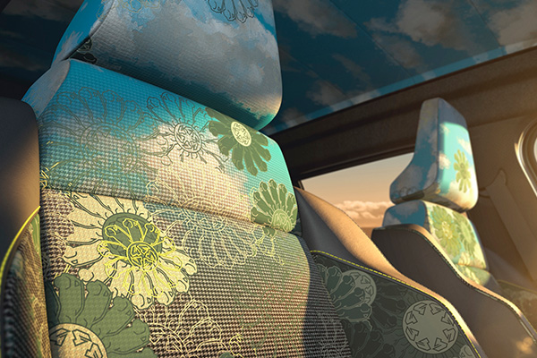 Taivas ja pilvet näyttävät nousevan istuimien takaata kohti sähköisesti toimivaa kankaista panoraamakattoa, kun taas istuimissa ne sulautuvat päivänkakkarakuosin väreihin.