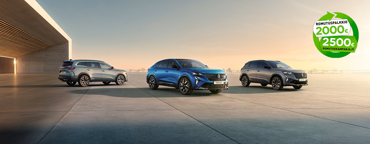 Koko Renault-mallisto kuuluu romutuspalkkion piiriin, tutustu alta lisää ja juuri itsellesi sopivin uusi auto.